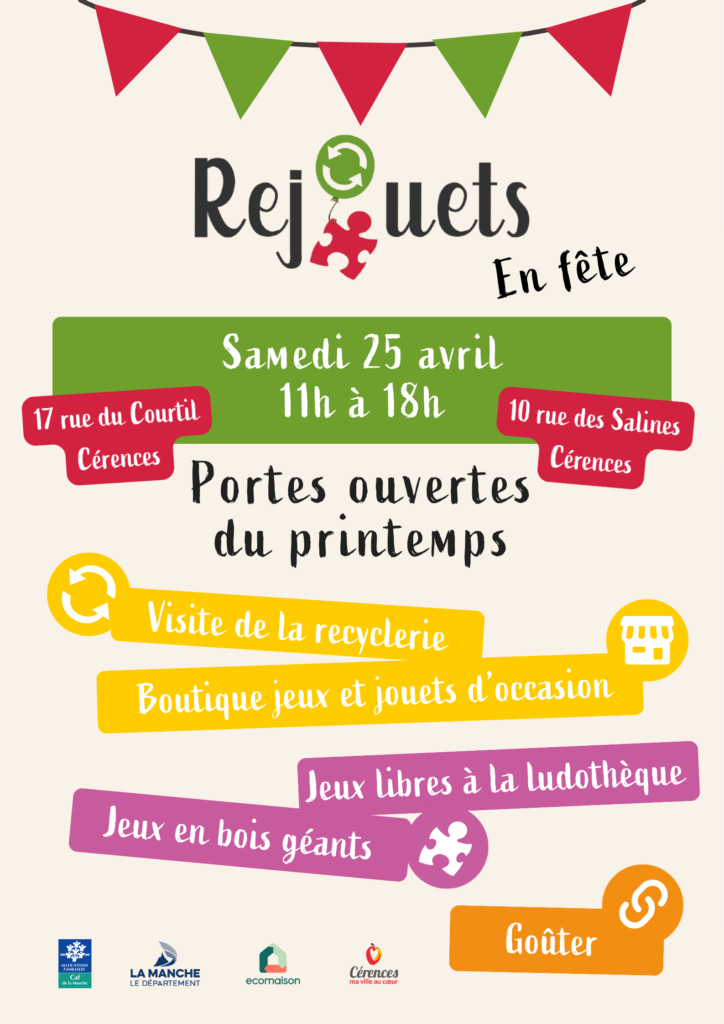 L’association Rejouets est née en 2010 de plusieurs envies d’un groupe d’amis : faire partager le plaisir du jeu, créer des lieux de rencontres dans le secteur de Bréhal et Cérences, laisser place à la créativité, à l’initiative de chacun et poser une petite pierre à l’édifice de la réduction des déchets. Le jeu et le jouet sont apparus comme un moyen idéal pour répondre à cette envie collective de sensibiliser au réemploi comme choix de consommation : un matériau peu ou pas recyclé, un moyen pour toucher le plus grand nombre. L’association Rejouets a souhaité dès le démarrage s’inscrire en complémentarité avec l’existant. Un réseau de partenaires s’est donc tissé autour de ce projet. C’est ainsi qu’a démarré la formidable aventure de Rejouets avec les habitants !